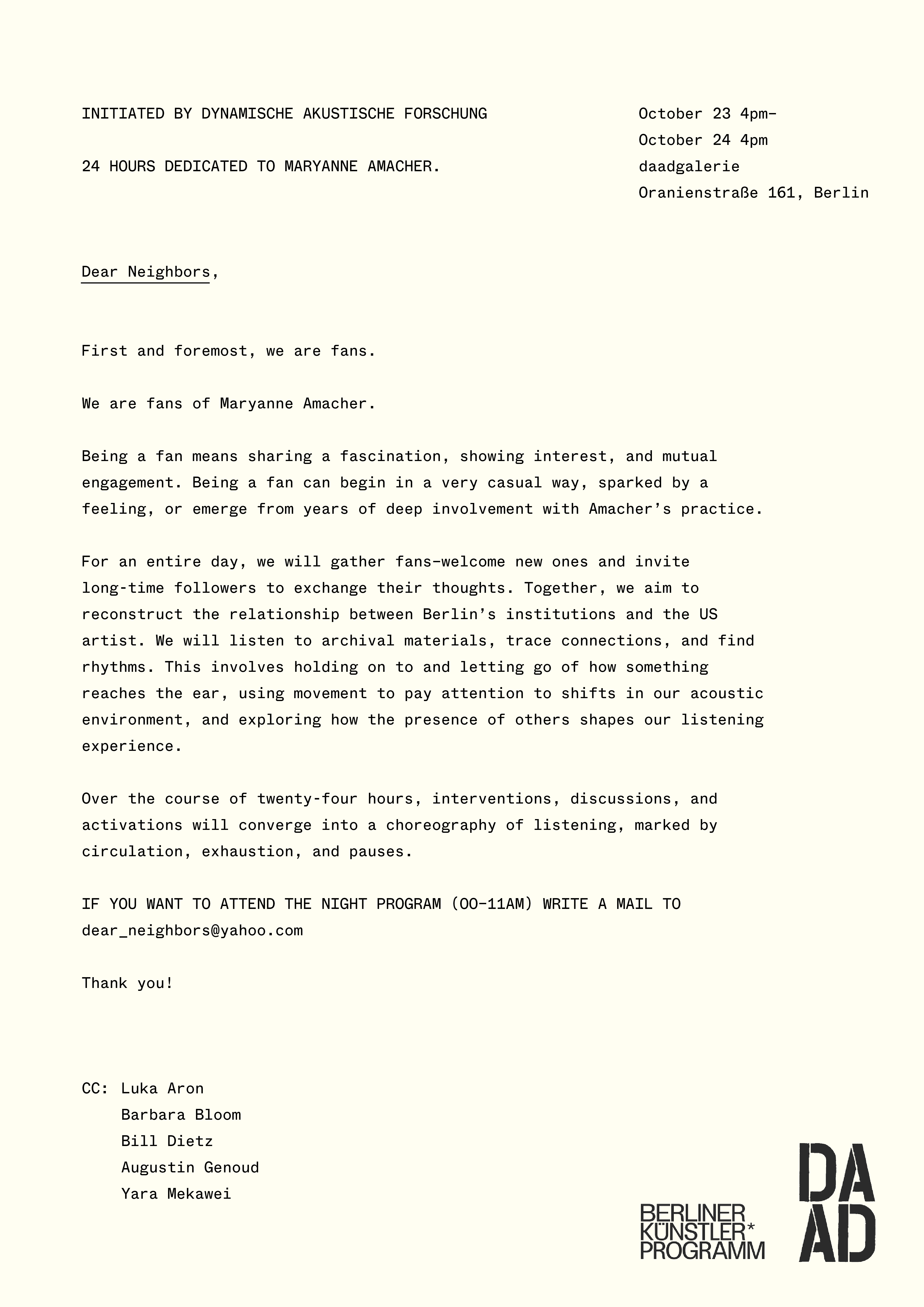 For an entire day, we will gather fans—welcome new ones and invite long-time followers to exchange their thoughts. Together, we aim to reconstruct the relationship between Berlin’s institutions and the US artist. We will listen to archival materials, trace connections, and find rhythms. This involves holding on to and letting go of how something reaches the ear, using movement to pay attention to shifts in our acoustic environment, and exploring how the presence of others shapes our listening experience.