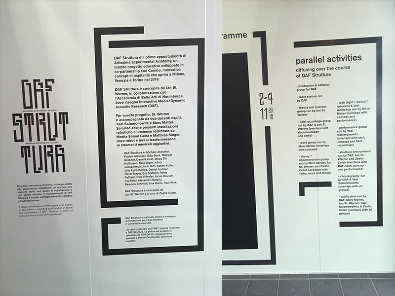 DAF Struttura was a light and sound installation that functions as a research and performance environment. For four days, during the Fair, Struttura was a stage, a workspace, a thinking place, an archive, a radio station, a recording studio, and an art space. Its coordination is based on collective learning and self-organization. Struttura opened at various times to members of the public. The audience had the opportunity to tune in via a short-throw radio transmission, join sonic walks, or enter within the struttura to hear lecture-performances, discussions, acoustic experiments, stagings of archival recordings, or new compositions. These was experimentally documented by the school, and a publication capturing these sound texts will be collectively conceived and launched early next year.
