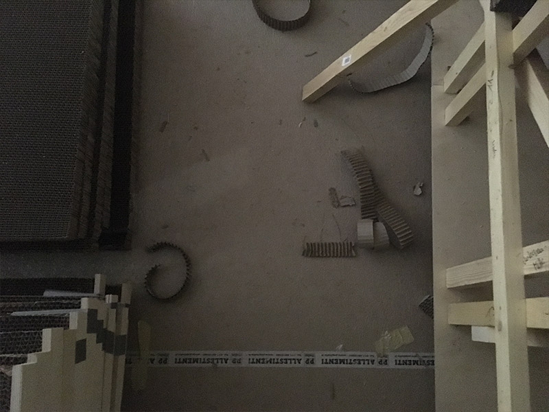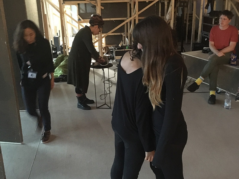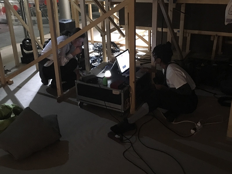 DAF Struttura was composed by Jan St. Werner in collaboration with the Academy of Fine Arts Nuremberg, where he teaches Interactive Media/Dynamic Acoustic Research (DAF). St. Werner was accompanied by two guest lecturers, Yael Solomonowitz and Marc Matter. There were additional robotic and light installations by Moritz Simon Geist and Matthias Singer, where the robots and lights work as musical instruments.